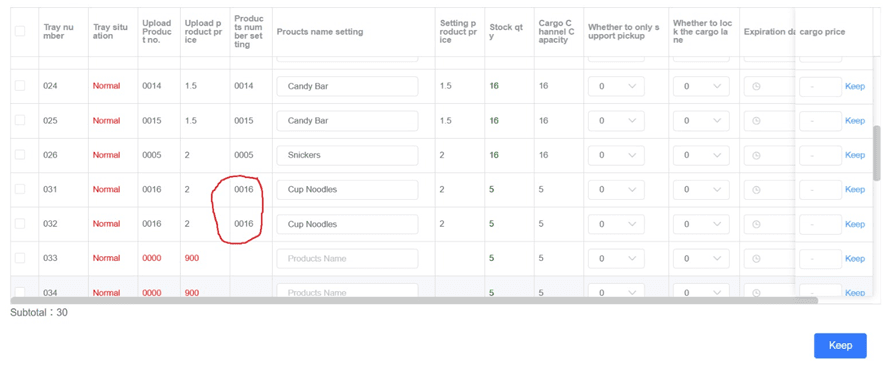 In the example below, Cup Noodles is using product number 0016 and has been assigned to two trays. Because of this, the machine will not display it correctly.