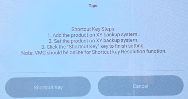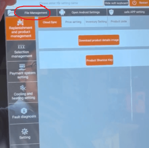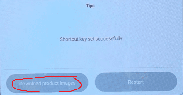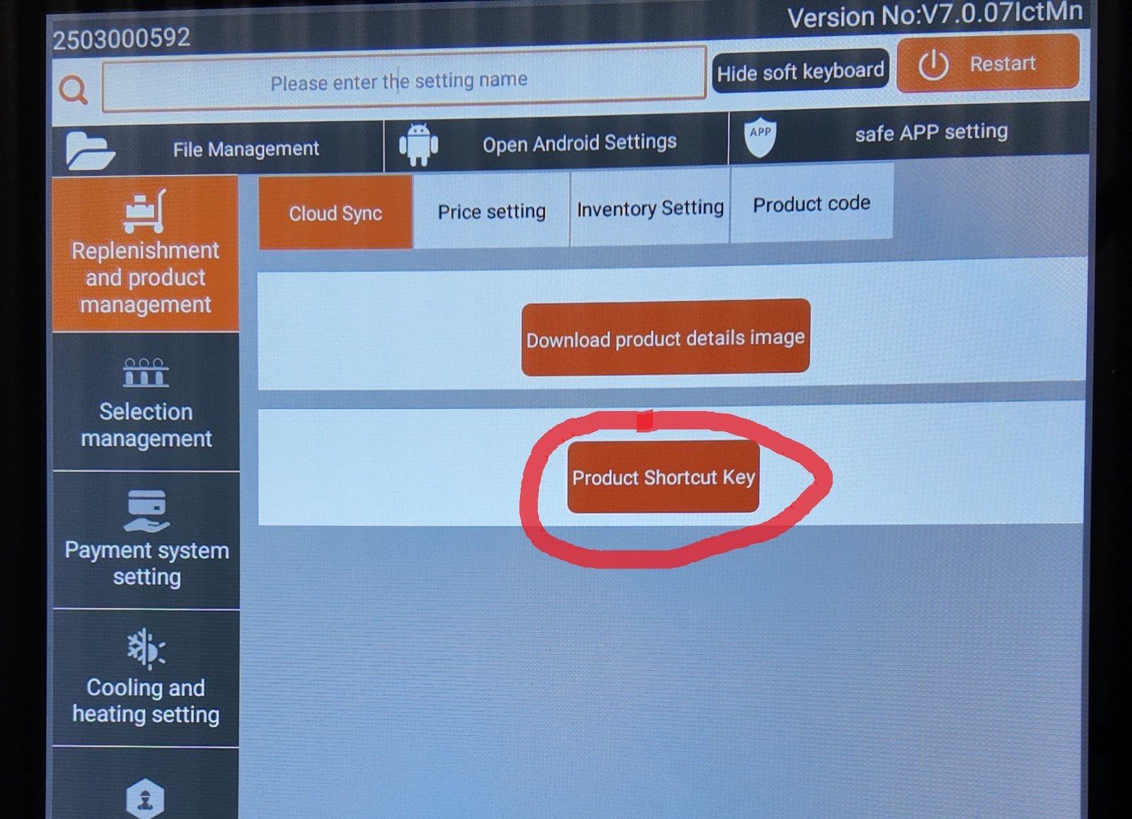 Once the machine restarts, click the red button again to get to the settings scren. On the main settings screen, click the Product Shortcut Key and follow the on-screen prompts to re-download the product information and images.