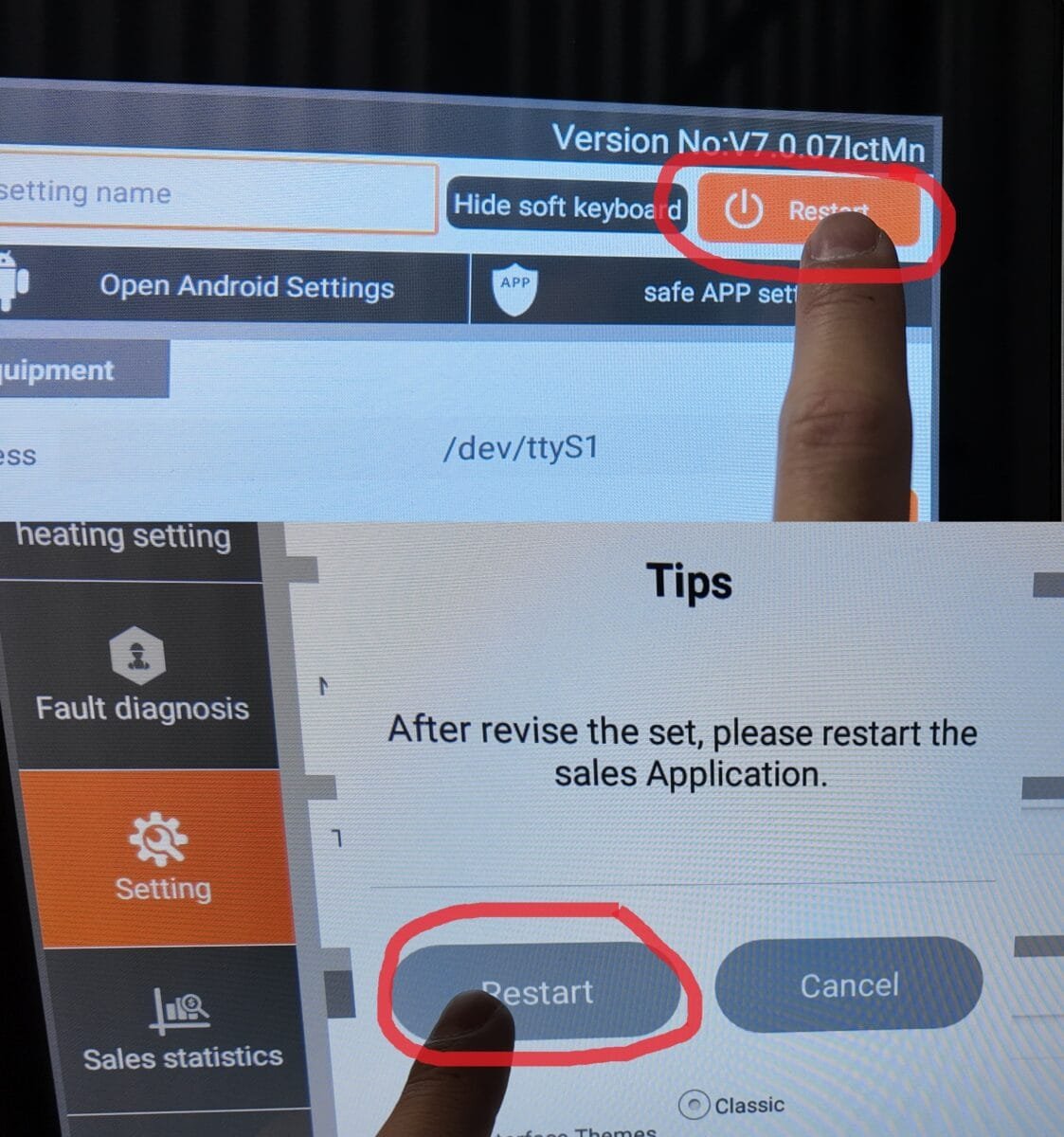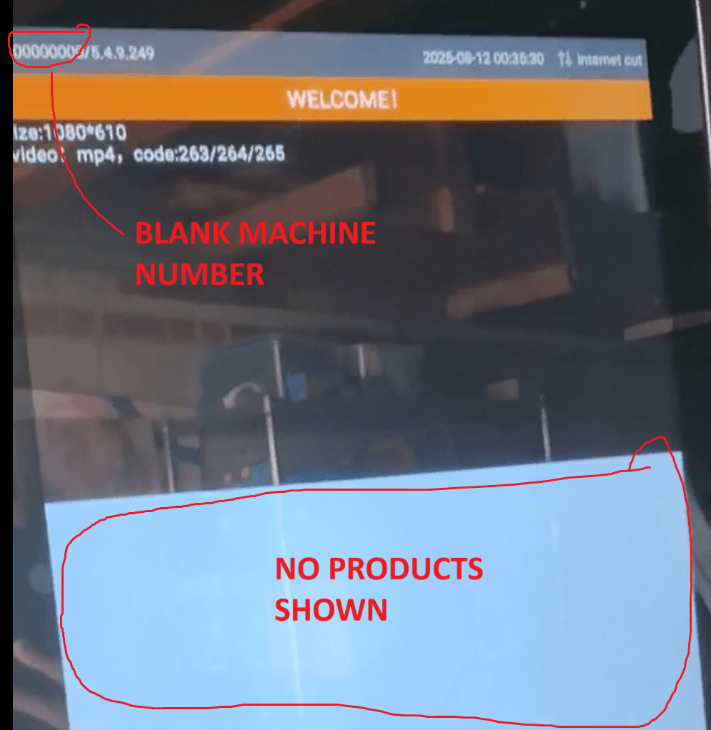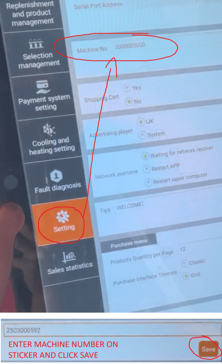 After installing the new firmware, your machine ID will have been reset along with all product information, so you will need to reset and redownload them. Begin by clicking the red button again to access Settings. The first step is to re-enter the machine number. Delete the old number and enter the machine number found on the sticker inside your machine. Enter it carefully, double-check that it’s correct, and click Save. Once saved successfully, restart the machine to apply the changes.